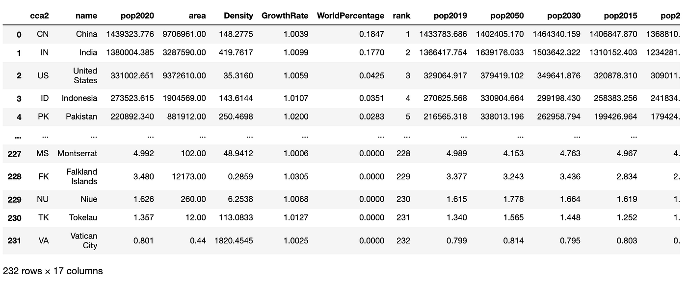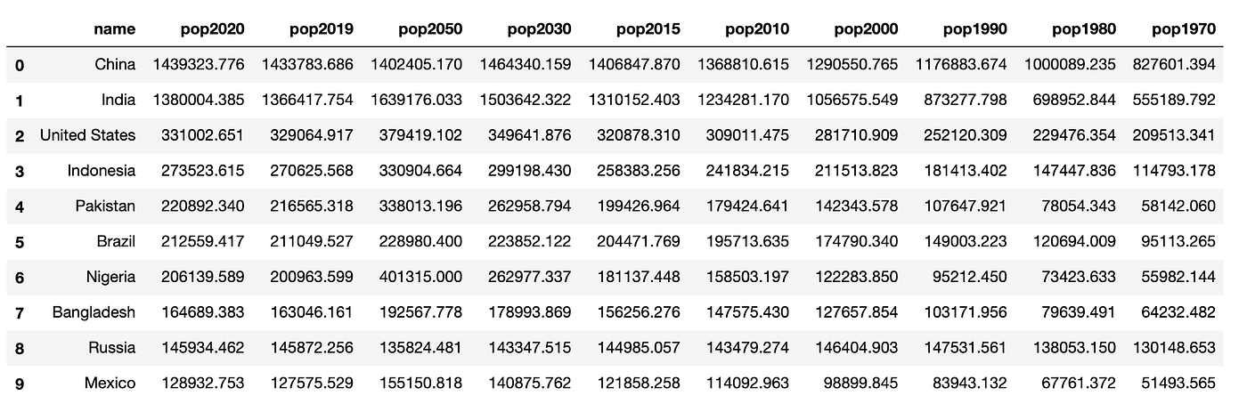 dataset.filter(similar = 'pop', axis = 1). #Method 1 In the bracket, similar volition search for all columns names containing 'pop'. The 'popular' doesn't need to be the starting of the column names. If we put like='n', we will become information from columns — 'proper noun', 'Density', 'WorldPercentage', and 'rank' because they all have 'n' in their names.